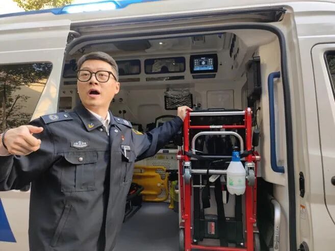 最后,同学们一同参观了救护车的内部,观摩了先进的医学仪器,学习救护车急救药品知识。还有同学作为志愿者,配合工作人员来了一场模拟演练:演示患者躺在担架被抬上救护车的过程。工作人员在一旁指导,对于出现的问题及时指出纠正。