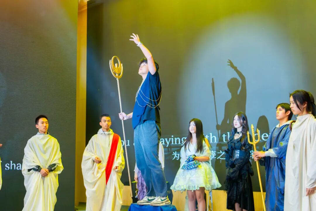 上半场的压轴节目,由G2-7班全体同学倾力呈现,他们演绎了音乐剧《Epic》中的选段《God Games》。复杂的剧情编排、投入的角色塑造、精美的服装道具,以及全班同学默契的舞台配合,展现了班级强大的凝聚力与创造力,为上半场演出画上一个震撼的句号。