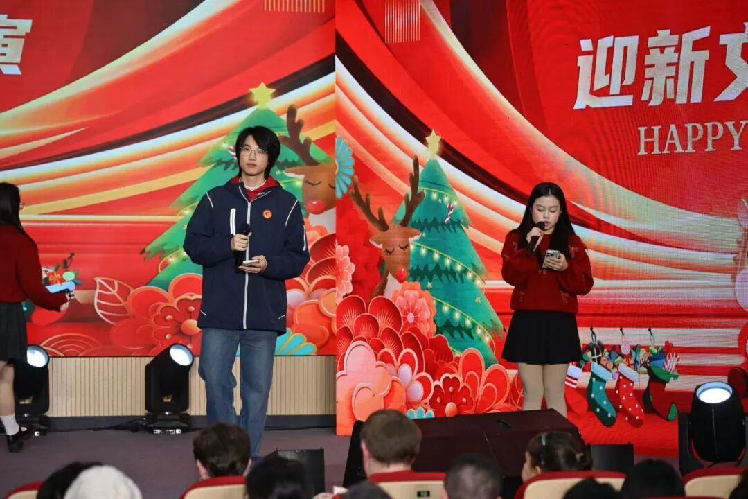 随着开场倒计时的声音落下,四位主持人——来自G1年级的常珈鸣、来自G2、A2年级的姜来、于曦尧、金若萱同学以双语温馨开场,带领大家一起重温了2025年在课堂、操场与社团中留下的成长足迹,并共同许下对2026年的全新期待。