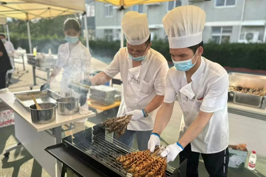 热闹的烧烤摊位上,香气四溢。同学们自己动手,享受着烤制美食的乐趣。欢声笑语此起彼伏,大家一边品尝着美味,一边交流着学习和生活的点滴。