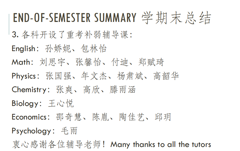 同时,学校在学期不同阶段根据学生需求开设了重考补弱辅导课,不轻易放弃每一位学生,为学生提供全方位的帮助。