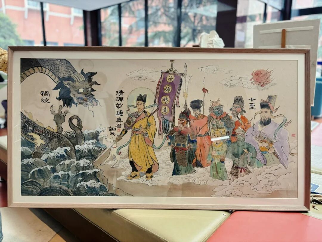 This work draws inspiration from the legend of "Erlang Slaying the Flood Dragon", depicting the story of “Zhao Yu” (revered as “Lord Zhao”) and the “Seven Saints”who vanquished a menacing flood dragon to protect the people. Zhao Yu was later canonized as the "The divine lord of the source of purity and the true path/way." (also known as “Erlang the sacred divinity”). The tale frequently appears on “Song Dynasty charm coins”, and this piece reimagines the narrative through a secondary creative adaptation.