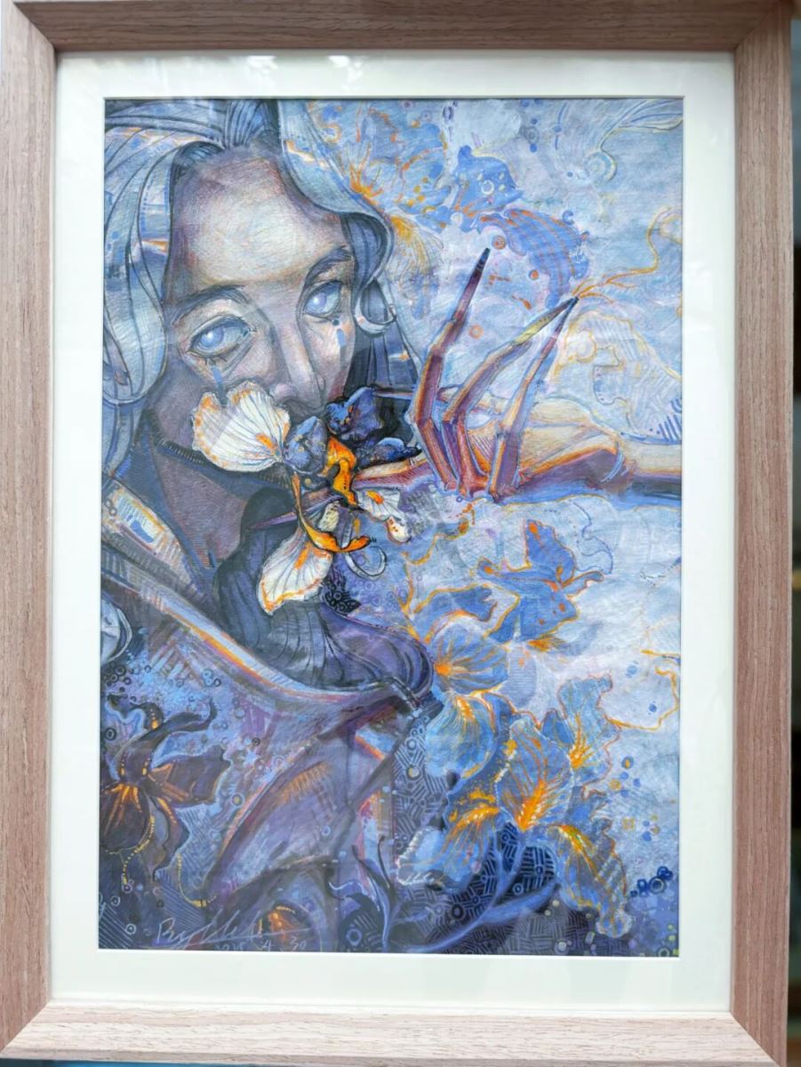 在创作《唤花》时,我以幽邃的蓝紫色调铺陈出朦胧而忧郁的氛围。背景中若隐若现的鸢尾花,如同低声呢喃,诉说着生命绚烂而脆弱的双重本质。画面中央,轻触唇瓣的鸢尾兰将未言之语凝结成思念的芬芳,悄然唤醒记忆深处最深沉的爱意——那是一种无法言说、却始终萦绕心间的温柔回响。