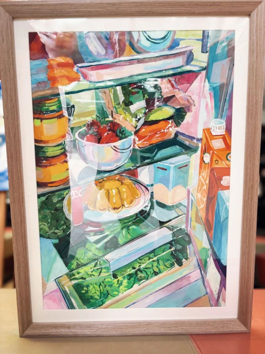 这幅水粉作品以冰箱内部为视角,用明快饱满的色彩描绘了蔬菜、水果、罐头和饮料的鲜活组合。跳跃的笔触与高饱和色调碰撞,赋予日常食材以生动的艺术张力——翠绿的菜叶、橙黄的罐头、透红的草莓在冷色调背景中形成强烈对比,仿佛奏响一曲视觉的欢快乐章。作品通过夸张的色彩表现与构图秩序,将平凡的储物空间转化为充满生活温度的静物剧场,传递出对日常之美的诗意观察。